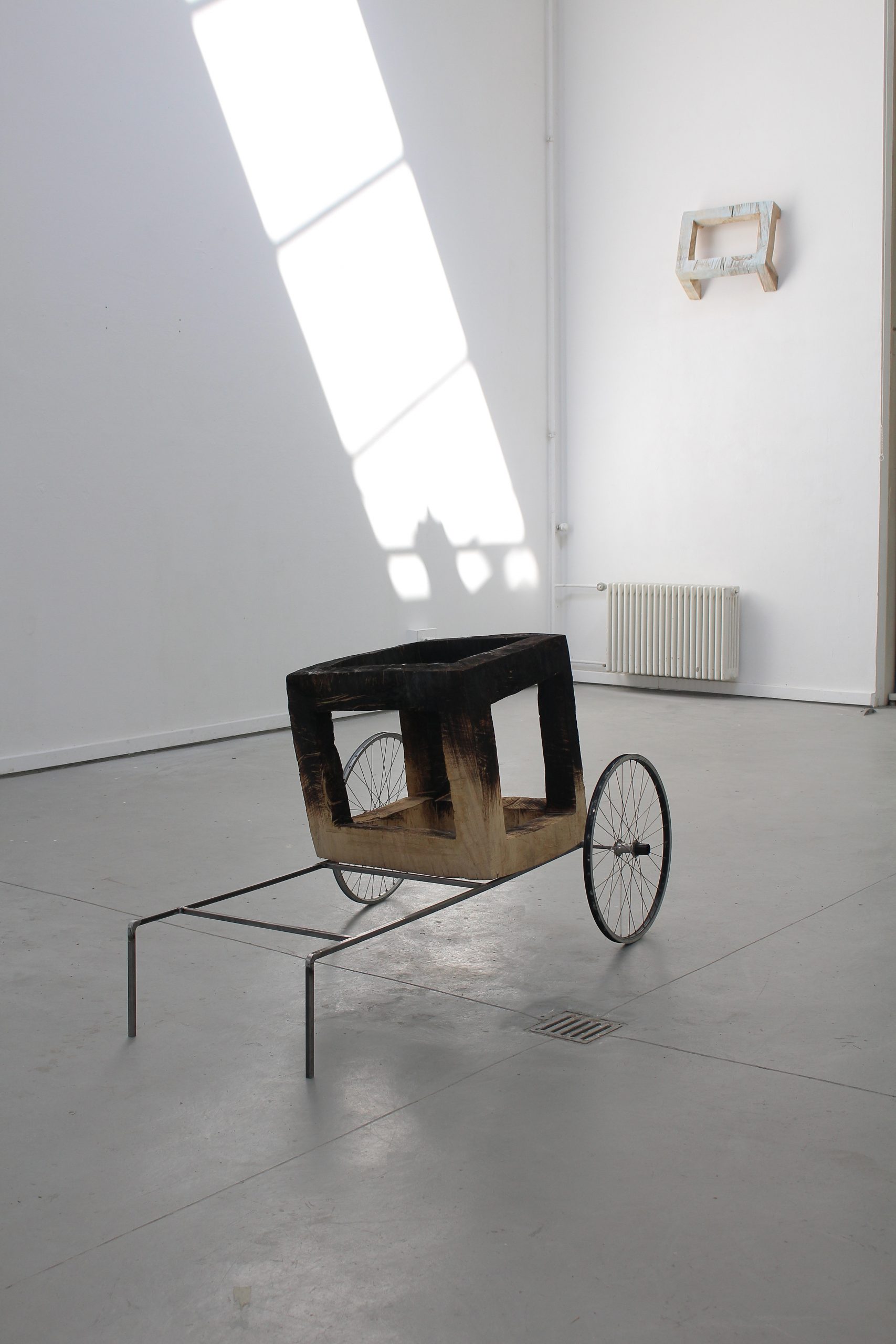 Was hast du dabei? Tagged: Sculpture Was hast du dabei?What do you have with you?eine gesägte und brannte Pappelstück, Räder, Metalrohre165 × 75 × 80 cm2017